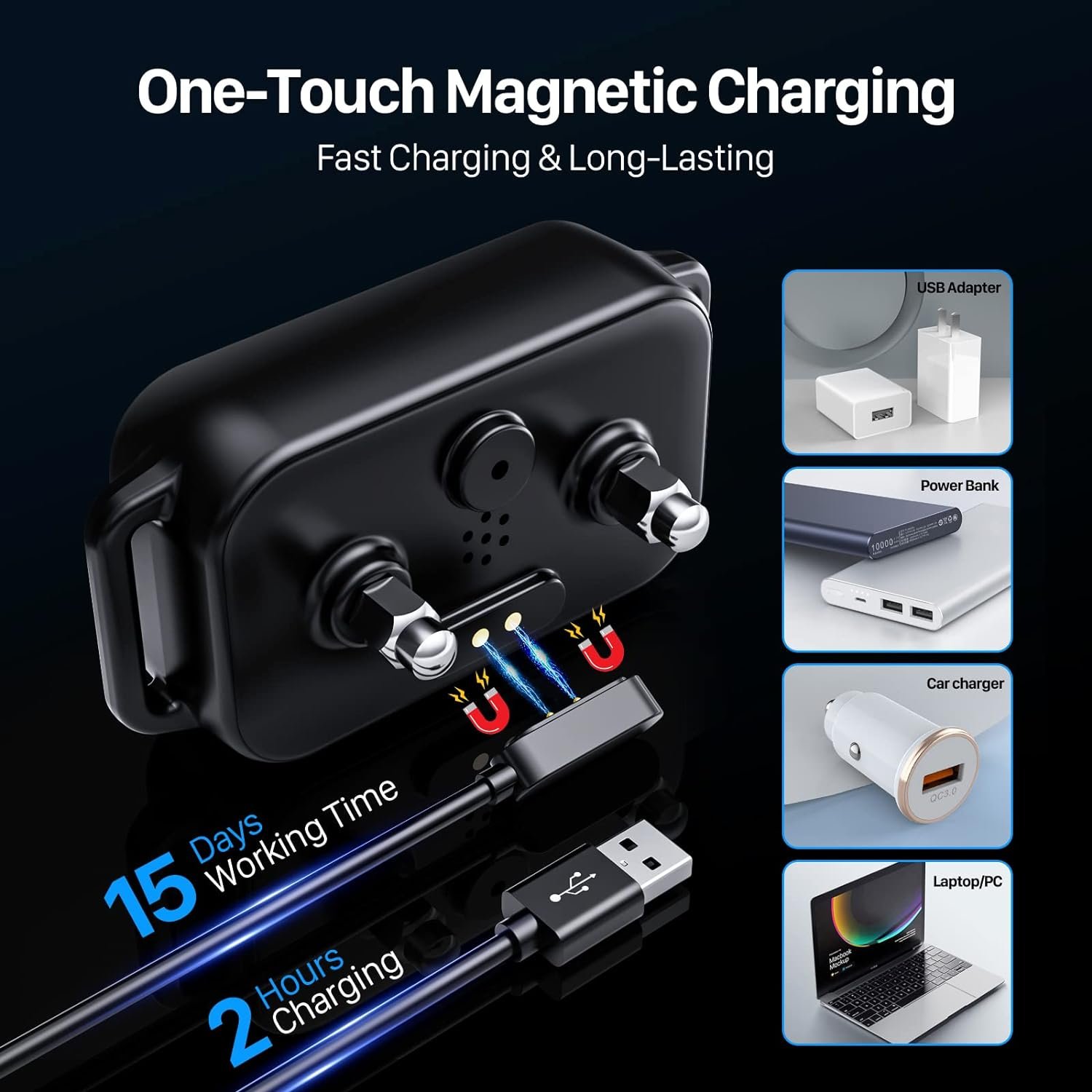With magnetic charging, it charges in 2 hours and can last up to 15 days. This anti-bark collar adopts an intuitive large LED color interface, which displays richer content and has a strong sense of technology. The color screen displays the power capacity and low battery reminder to provide convenient use